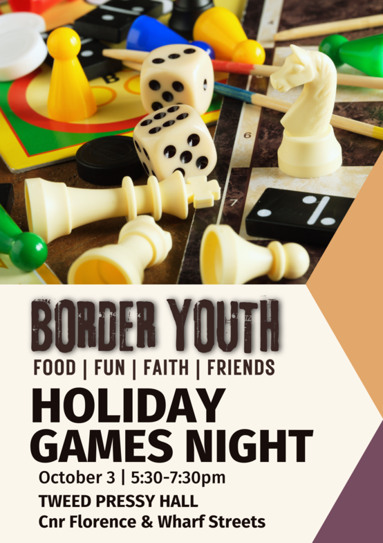 This week Border Youth is at our usual location at Tweed Presbyterian Church Hall from 5:30-7:30pm. This week we will be playing some lower key games for holidays.