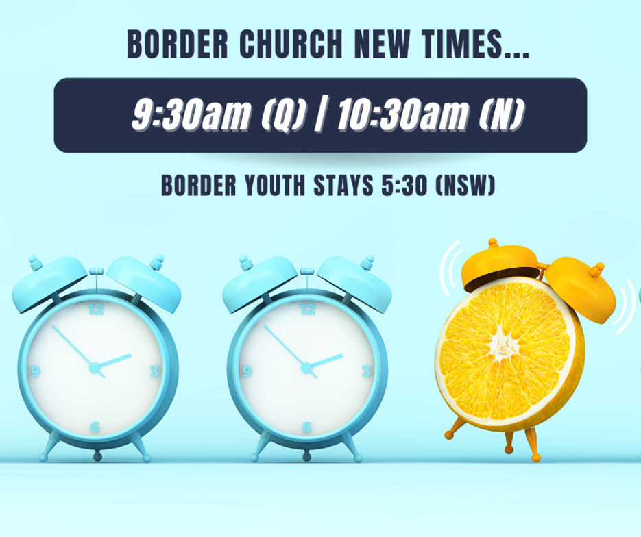 Starting next week, Daylight Savings will be in effect and our Church services will be shifting from starting at 10am (non-DST) to 9:30am Qld/10:30am NSW time. Please make adjustments to your alarms. Youth will be 4:30pm-6:30pm QLD time/5:30pm-7:30pm NSW time.