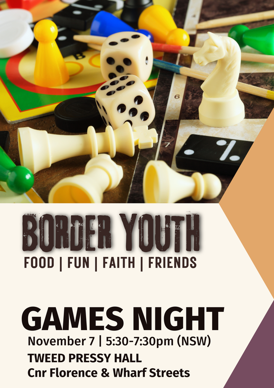 This week Border Youth is at our usual location at Tweed Presbyterian Church Hall, from 5:30-7:30pm NSW Time. This week we will be playing indoor games.
