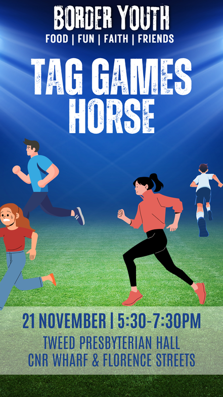 This week Border Youth is at our usual location at Tweed Presbyterian Church Hall, from 5:30-7:30pm NSW Time. This week we will be having pizza and tag games and HORSE down on the oval.