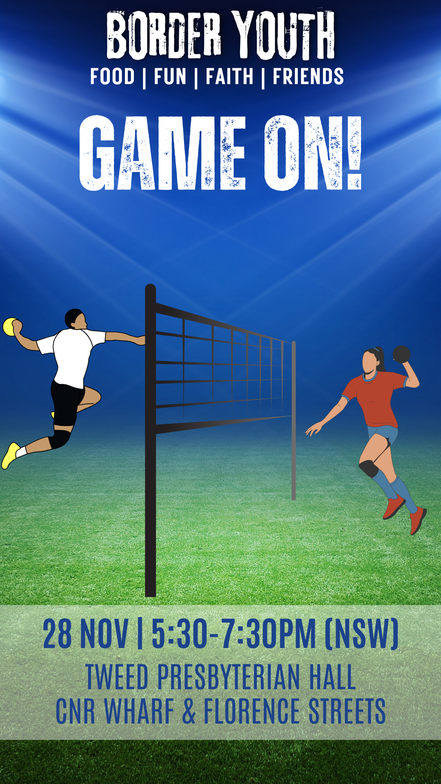 This week Border Youth is at our usual location at Tweed Presbyterian Church Hall, from 5:30-7:30pm NSW Time. This week we will be playing volleyball.